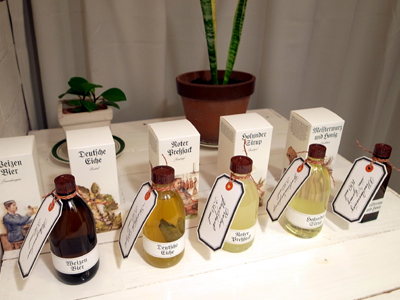左から ●ビールのシャンプー。 ●どんぐりの葉っぱ入りバスオイル。 ●ソーセージ由来のスパイシーな香りのハンドソープ。 ●花の成分で作られたボディーソープ。 ●ハチミツとハーブのハンドクリーム。 |